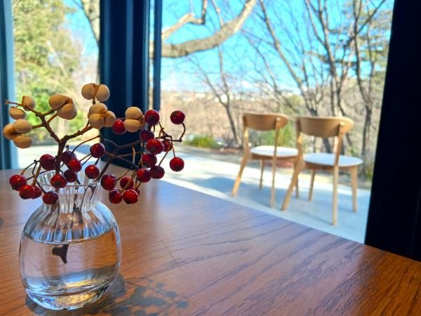 店内は、テーブル席が5つとカウンター席があります。ゆったりめのテーブルで、周りを気にせず過ごせる空間です。大きなガラス窓からは、木が揺れ青い空も広がる風景が。春になると、草木のみどりが映える景色を望めることでしょう。