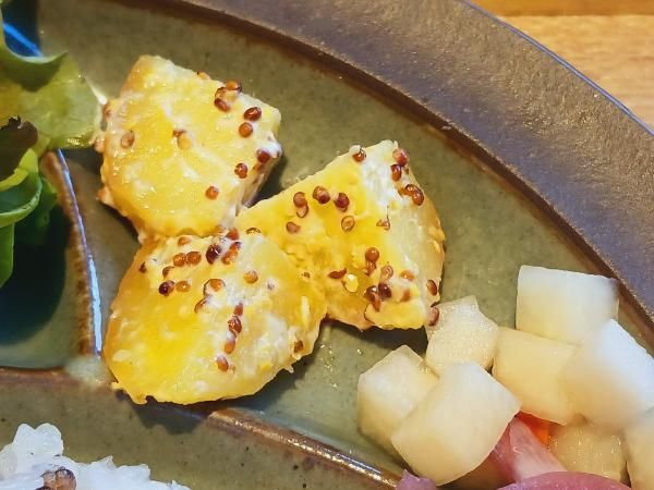 付け合わせは、ポテトのマスタード和えと野菜のピクルス。さっぱりした味付けで、カレーにぴったり。