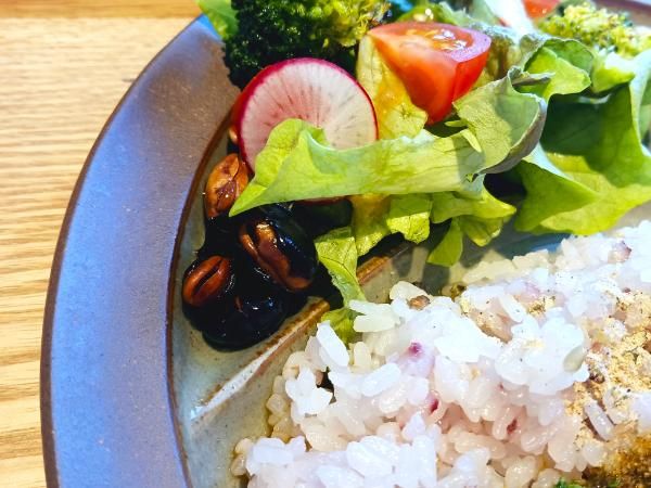 サラダの横に隠れていたのは、黒豆! 私、黒豆が大好きなもので、見つけた時にはテンションがあがってしまい、思わずアップで写真を♪
