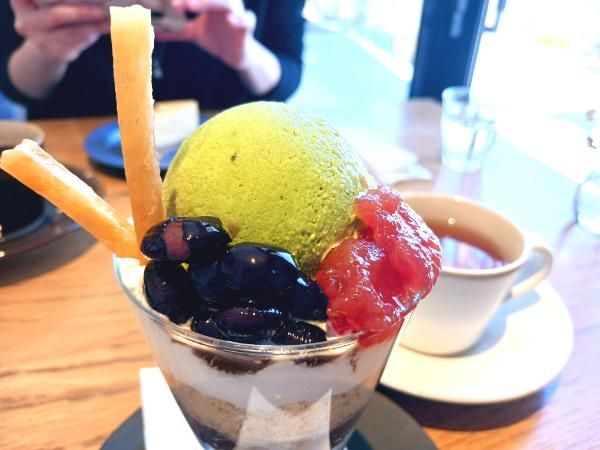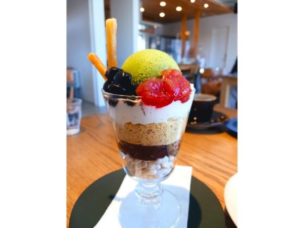 こちらも数量限定ですよ! 抹茶アイス、黒豆、季節のフルーツジャム、きな粉ロールケーキ、あんこ、芋けんぴが入った、和素材がたっぷりのパフェ。