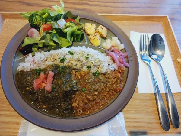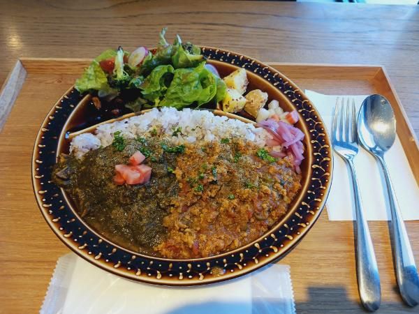 この日は、月曜~木曜日しか味わえない数量限定の「みどり特製2種盛カレープレート ¥1,680」をいただきました。スパイスキーマカレーとほうれん草のカレーがワンプレートで楽しめます。