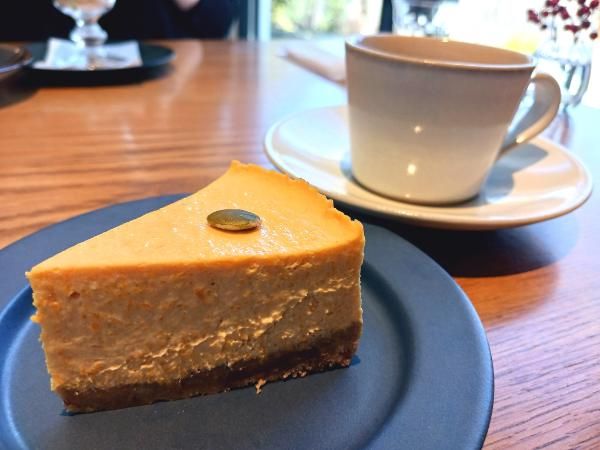 しっとりとしてなめらかな、ほんのりかぼちゃ味のチーズケーキです。見た目よりも軽い口当たりで、食後なのにぺろっと食べられました。