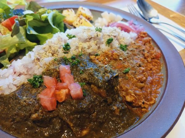 ほうれん草のカレーは、スパイスキーマカレーとは全く違う風味で、まろやかな口当たりです。濃厚さもあり、スパイスキーマカレーとのバランスも抜群!