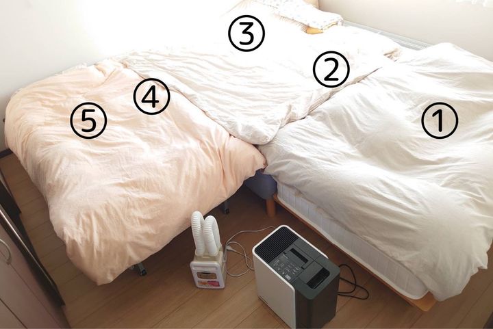 実はそれがわが家にはメリットでした。1番寝相が悪い1歳次男は隙間があると落ちまくるので、なるべく隙間がない状態がベストです。1に母、2に長男、3に次男、4に長女、5に父で寝ています。子どもたちを挟みこむことで落下防止。寝相の悪さで定位置にはいないので、これは就寝時のみの場所です。