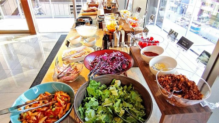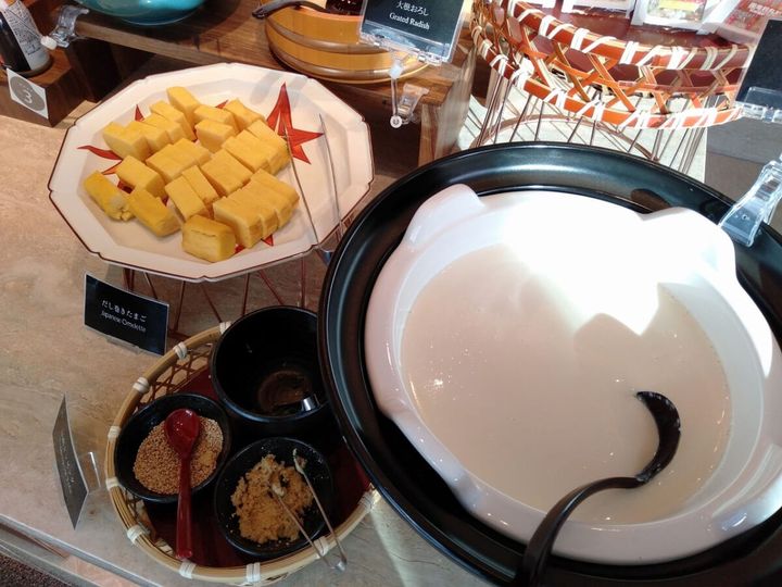 和・洋からなる約80種類もの朝食ビュッフェもラウンジで。大豆のまろやかな風味を感じられる手作り豆腐や大阪ミナミの雰囲気を感じるかす汁などレパートリーも豊富です。厨房で精米までしているという、ふっくら艶光りする炊き立てのご飯も見逃せません!