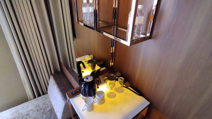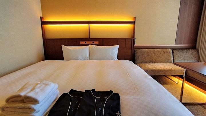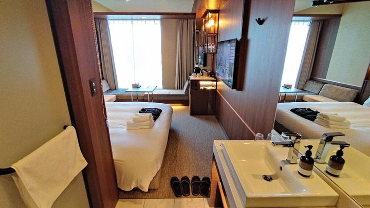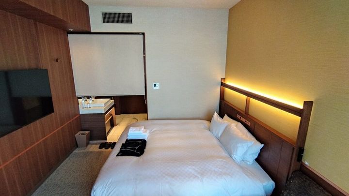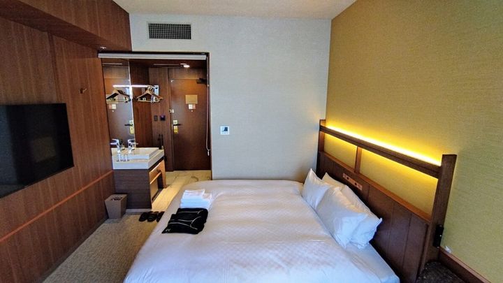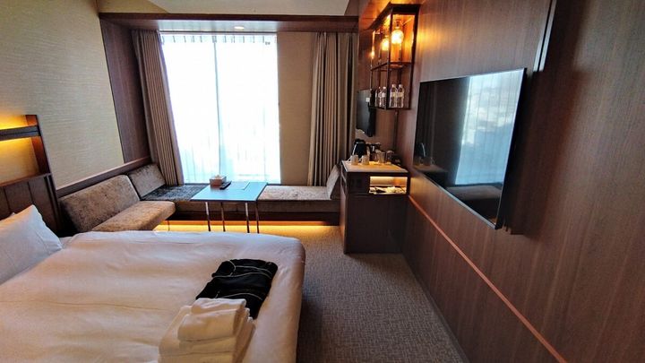 お寺にスカイスパ、ビジホ超えのスペックをもったホテルの客室も素敵なんです! なんたって唯一無二の体験を届ける“4つ星ホテル”がコンセプト。宿泊したのは全180室の中で、1番多い客室タイプのキングルーム(90室)。一般的なシングルルームに、キングサイズのベッドが設えられているのも“4つ星”ならではの優雅さです。