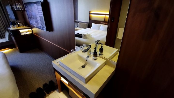 広さは約20平方メートル。客室アプローチに洗面シンクを設けた個性的な造り。