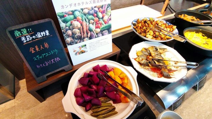 旬の野菜を使った本日の温野菜は、金美人参や紅くるり大根など。新鮮さを物語る鮮明な色合いに加え、ホクホクとした素材のおいしさがダイレクトに伝わってくるよう。インバウンドの利用が多いということもあり、ドライフルーツやナッツ類が充実していることも特徴的です。
