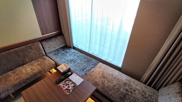ほらね! ウェットスペースを使っているときは寝室から目隠しになり、客室に誰か訪ねてきたときには、部屋が丸見えになるのを防いでくれます。シンクレイアウト・窓際の小上がりソファ・目隠しロールカーテンなど、コンパクトな客室に機能を集約させ、より自由度が高く居心地のいい空間にデザインされているのがスゴイ!