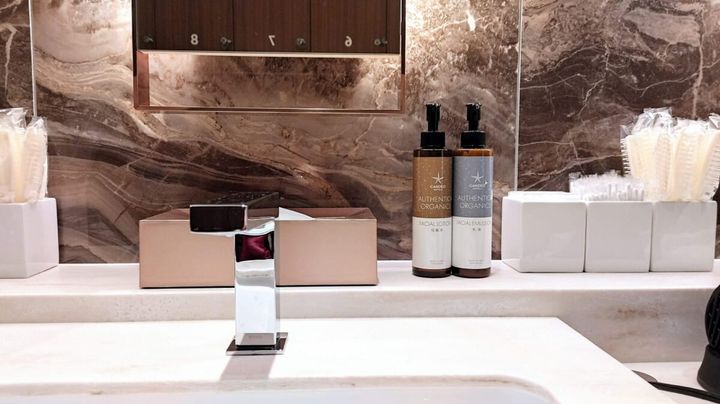 浴場内には、ハーブ系の心地好い香りがふわっと広がるオリジナルのボディソープやシャンプー、コンディショナー、洗顔フォームなどが備えられ、脱衣場には化粧水や乳液なども。クレンジングはないので持参してください。