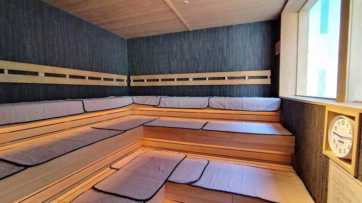 寺院と一体化した独創性もさることながら、「カンデオホテルズ大阪心斎橋」の真骨頂といえるのが「スカイスパ」。地上約55m、ホテル最上階の15階に設けられたスパは、大阪の街並みを一望。もちろん男女別に設けられ、内湯や露天風呂、オートロウリュのサウナに加え水風呂も完備。