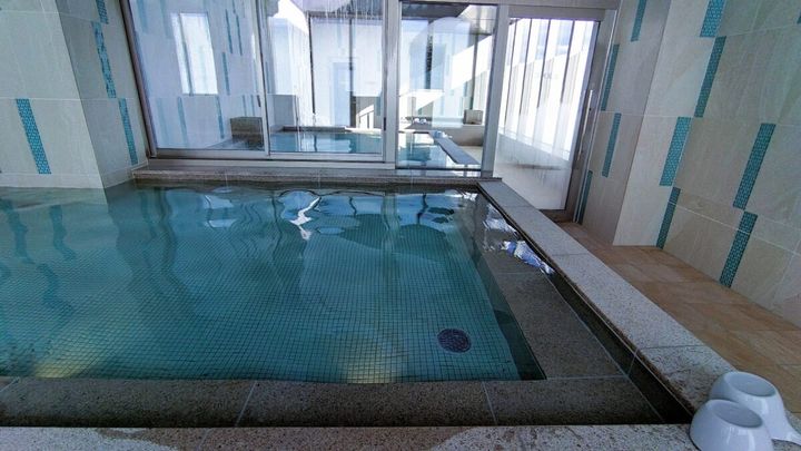 内湯もガラス面が多く、空色のタイルがアクセントをつくり爽快。西側にある男性用スパの方が広く、遮られることのないヌケ感ある眺めを楽しめます。