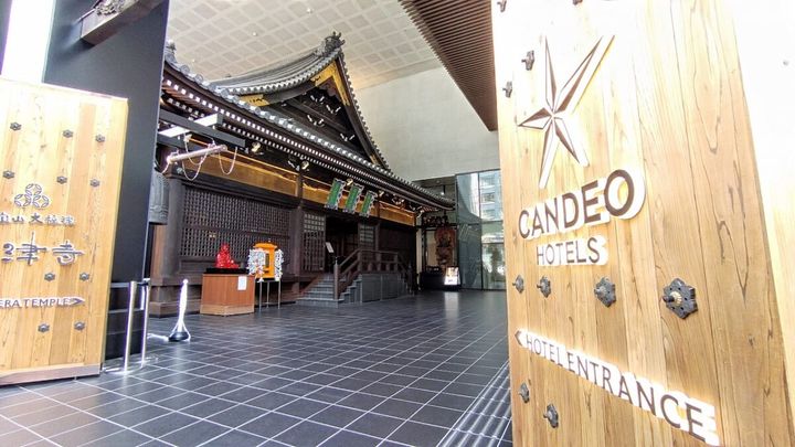 御堂筋に面した、大阪ミナミのド真ん中にある「カンデオホテルズ大阪心斎橋」。これがホテルのエントランス。えっ、お寺でしょ! と思うことなかれ。約4年にわたる大規模工事によって誕生した「三津寺」と一体化したホテルなのです。ということは…… お寺の境内を通ってレセプションへ。寺院の境内からホテルへアプローチ! 初めてだわこの感覚!!