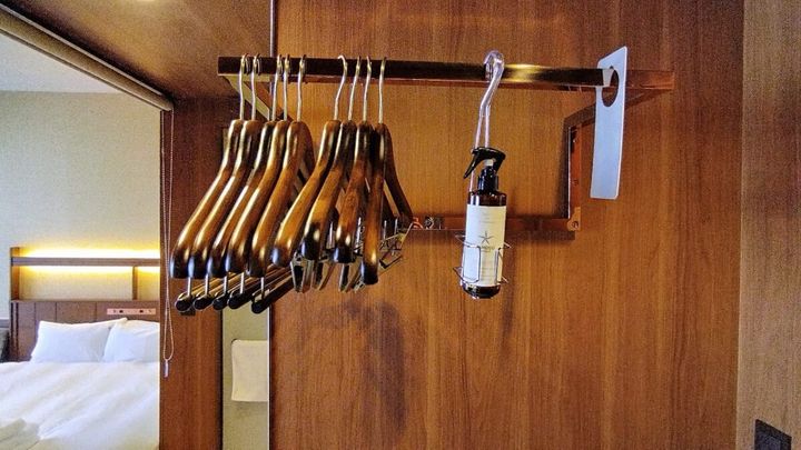 壁面ハンガーラックではなく、しっかり吊るすことができるクローゼット型ラックも、数日滞在するときや洋服が多いときには実用性が高く便利。加湿機能付き空気清浄機などはリクエストをすれば持ってきてくれます。