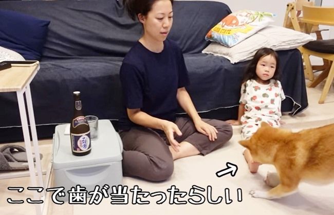 ボールを取ろうとした際、花子ちゃんの歯がモモ子ちゃんの足に軽く当たってしまった様子。