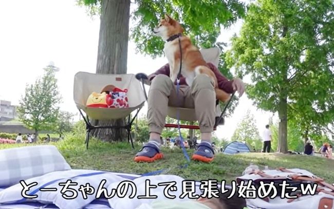 パパの膝の上で見張りを始めました。