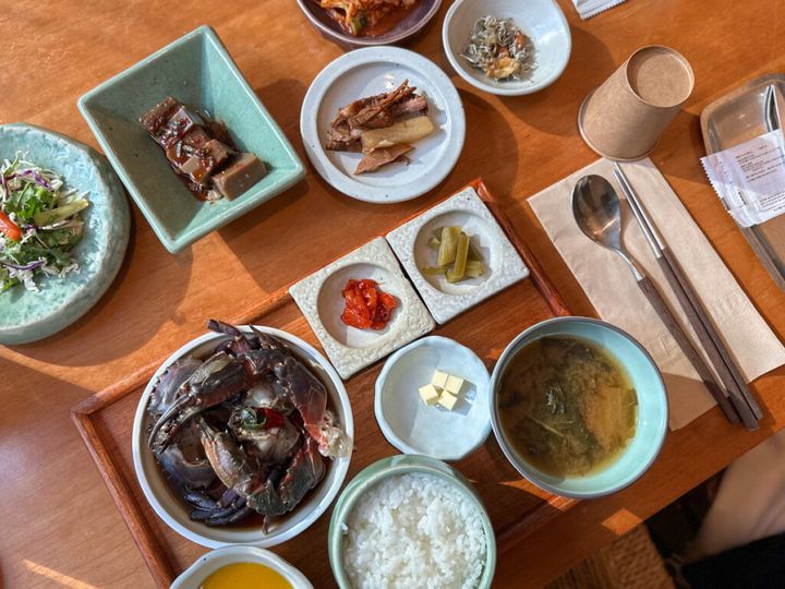中でもカンジャンケジャンの定食は周りのテーブルでも注文している人が多く、私も真似してオーダー!甘辛い醤油ダレに漬け込まれた生の蟹を手掴みでいただきます(ビニールの手袋も貰えました)。最後は、甲羅に入った味噌にご飯を入れて…