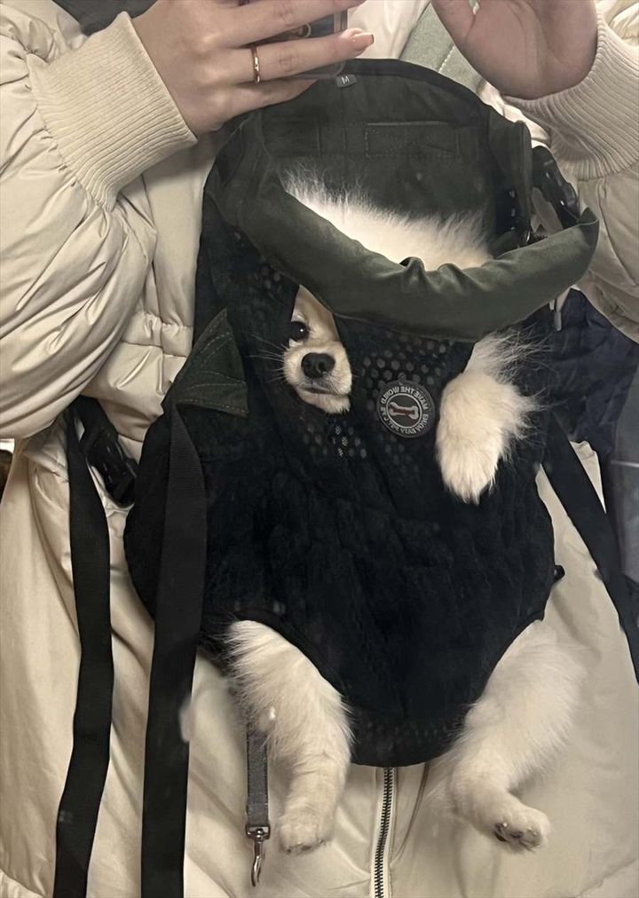 犬を運ぶために便利な抱っこ紐ですが、犬の大きさや成長度合いによってはサイズが合わない時もありますよね。 今回は、一時的に拝借したお兄ちゃんの抱っこ紐のサイズが合わなすぎて顔まですっぽり入ってしまったポメラニアンの姿をご紹介します。