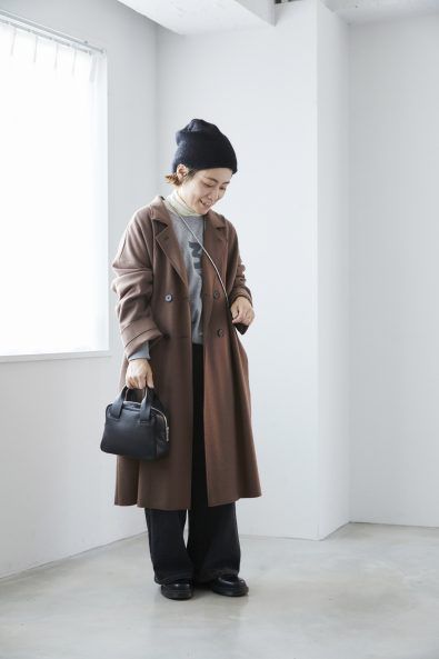 合わせたのはBIGOTERの小ぶりなバッグ。革の質感が装いに上品さをプラスしています。
