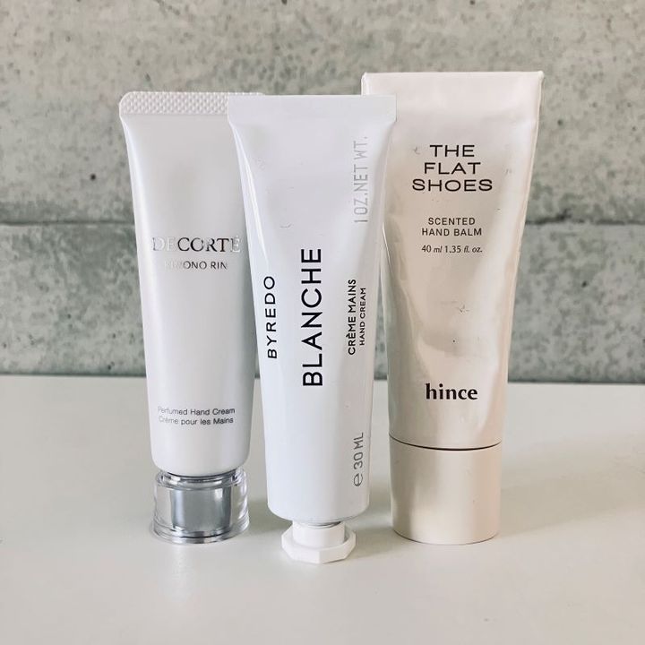 〈右から〉hince センティドハンドバーム THE FLAT SHOES、バイレード ハンドクリーム ブランシュ、コスメデコルテ キモノ リン パフュームド ハンドクリーム