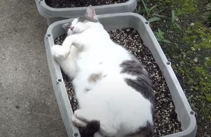 3. このベッド快適だにゃ〜♪ プランターでゴロゴロ猫。