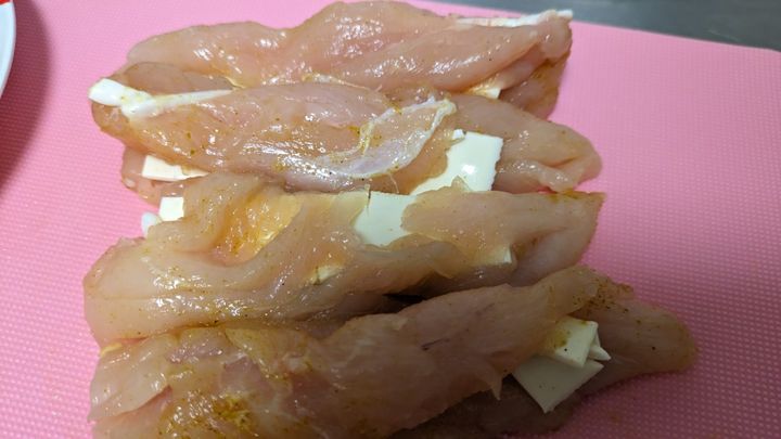 鶏ササミに塩とカレー粉をまぶします。カレー粉の代わりにコンソメでもおいしいです。その後、「スライスチーズ」を4等分にして2枚挟み込みます。しっかり巻けなくても、この後、小麦粉・溶き卵・パン粉で補うので大丈夫。