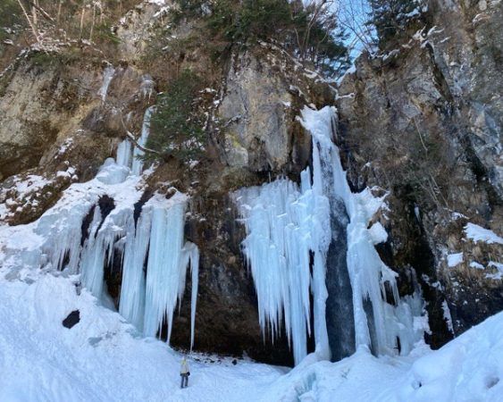 こちらが庵滝です。見事に滝が凍って大きな氷柱みたいになっています。