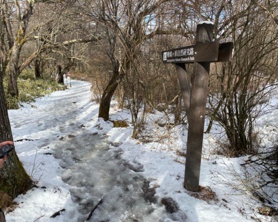 駐車場に車を停めたらここからスタートします。寒いので雪山登山向けの服装で行きましょう!靴も滑ってしまうので、私はチェーンスパイクで行きました。