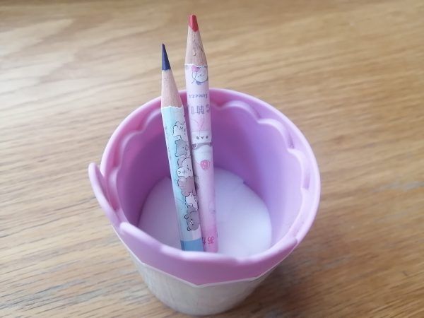鉛筆が短くなると、鉛筆たての中で埋もれてしまうことがよくあります。鉛筆たての底にメラニンスポンジを好みの高さにカッターやはさみで切って調整をして、底上げをすると使いやすくなります。