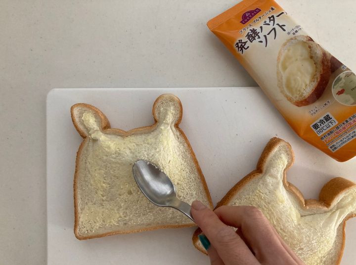 (3)パン全体にバターを塗ったら(1)に載せてオーブンできつね色になるまで焼きます。