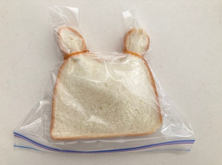 (1)食パンを保存袋に入れて、角2か所を輪ゴムで縛って数時間置きます。