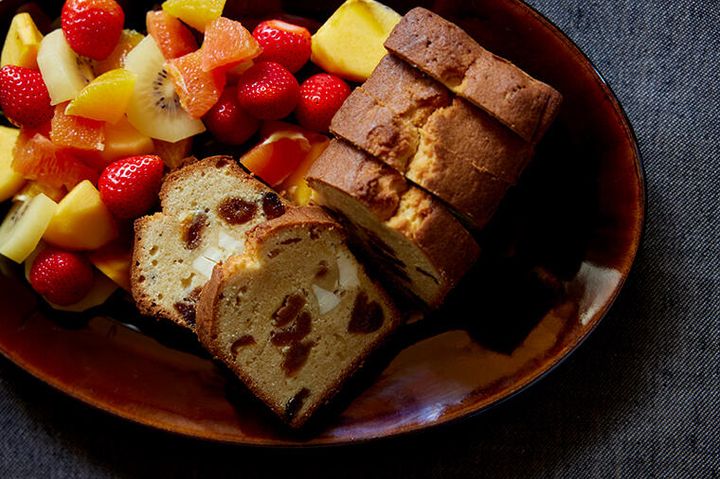 型からはずし、ケーキクーラーにのせて冷ます。切り分けて器に盛り、食べやすい大きさに切って混ぜ合わせたフルーツを添える。
