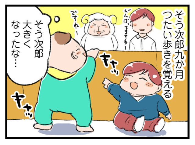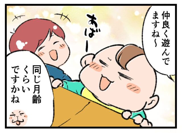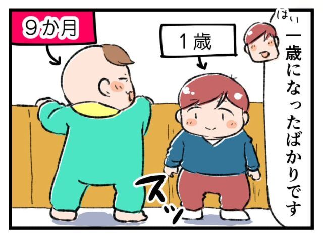 5歳長男ゆう坊くん、1歳次男そう次郎くん兄弟のパパである左近寺しゅうりさんから、そう次郎くんが伝い歩きを覚えた生後9ヶ月の頃のお話です。そう次郎くんとキッズスペースに行ったとき、同じ月齢くらいの子と一緒に遊んでいると・・・。