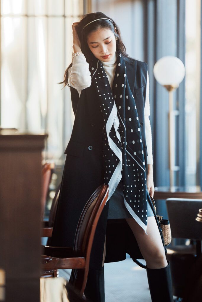 さらにモノトーン柄のロングスカーフで、縦ラインを強調しつつ華やかさをプラス。洗練された大人可愛い女子会スタイルに!ジレ※着回し タートルニット¥26,400(スローン/ザ ショップ スローン 新静岡セノバ店)スカート¥16,500(マイストラーダ/マイストラーダ プレスルーム)スカーフ¥14,300(マニプリ)バッグ¥202,400(ザンケッティ/八木通商)ブーツ¥121,000(ペリーコ/アマン)カチューシャ¥17,600(アレクサンドル ドゥ パリ/アレクサンドル ドゥ パリ GINZA SIX店)イヤリング¥4,860ブレスレット¥29,400(ともにアビステ)