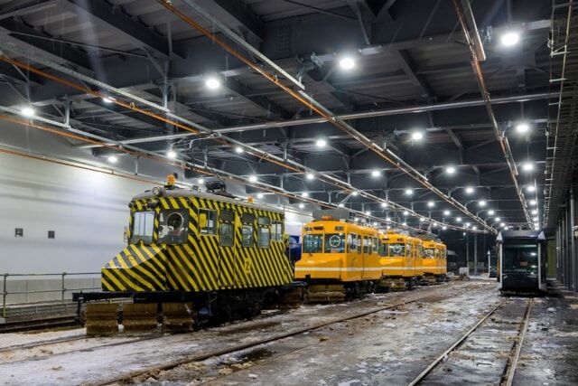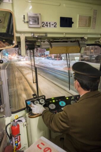 事業所での休憩中、路面電車の乗り降りは扉を手動で開け締めできる特別な体験。大きな車庫もあって、建物内には入れませんが外から見学ができます。この夜は除雪用の “ササラ電車” を見ることができました。竹製のブラシ「ササラ」を回転させながら除雪する姿は、北海道の冬の風物詩となっています。