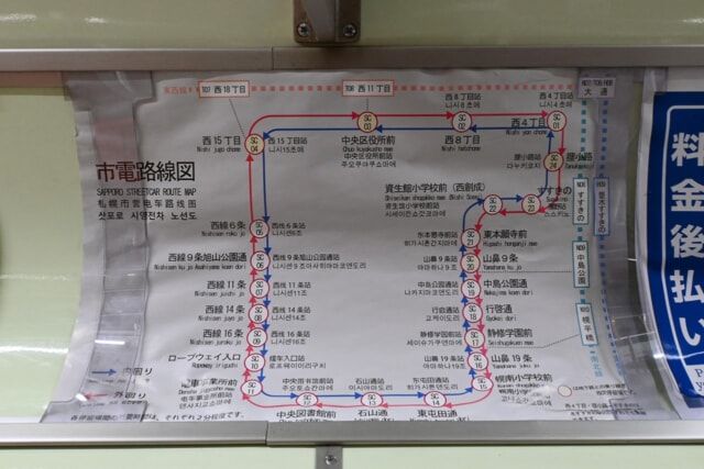 この日は、1960年に札幌で製造された240形の丸みをおびたレトロな車両です。停留所からまずスイッチバック方式で逆方向のすすきの駅まで進みスタートします。