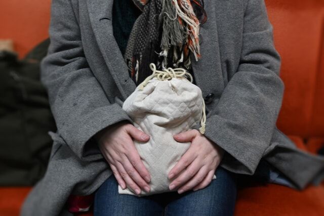 1人にひとつ配られるあずきの湯たんぽ。乾燥させたあずきを温めると、優しい温かみがいつまでも続くゆたんぽで、以前北海道ではよく使われていたとのこと。繰返し使えて、環境にも優しく、あずきの香りがホンワカ。赤ちゃんや小さな子供でも安心して使えます。こたつとダブルで使えば、ぽっかぽか。