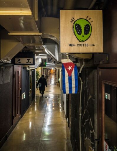 ▲宇宙人の看板は旅好きのご主人が経営する「0番地珈琲店」