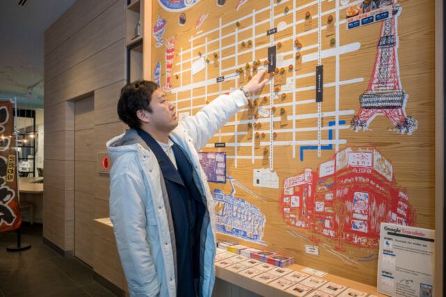 ホテル1階の「ごきんじょマップ」前がツアーの集合地点。OMOレンジャーと共に開拓するディープなお散歩ツアーです。