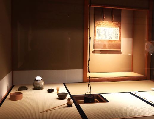 展示室6では、茶室の天井からつるされた《雲龍釡(うんりゅうがま)》が目を引きます。日に日に暖かさが増して行く春は、釜をつるす「釣り釜」が好まれるとか。 茶室にも春の訪れを感じさせる茶道具取り合わせです。