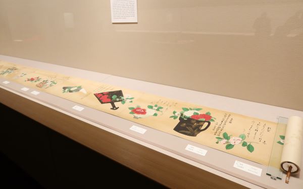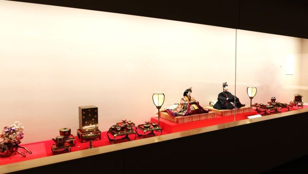 展示室5では、ひな人形と百椿図の展示。春の訪れを告げる華やかなひな飾りです。 内裏雛(だいりびな)と雛道具(ひなどうぐ)が並ぶ展示会場の両側に《百椿図》が華やかに広げられていました。 内裏雛は京の公家装束(くげしょうぞく)を忠実に再現、ミニチュアのように精巧な雛道具は江戸の伝統的な細工の技。京の雅と江戸の粋をあわせた明治時代の内裏雛です。