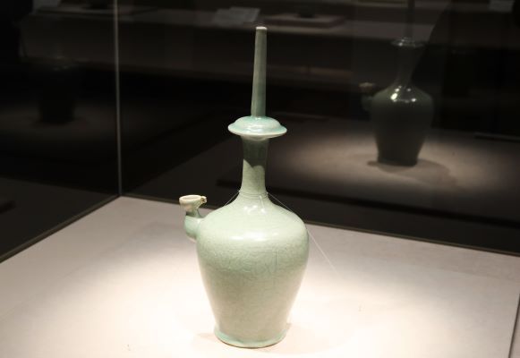 重文《青磁陽刻蓮華唐草文浄瓶(せいじようこくれんげからくさもんじょうへい)》の透明感のある青