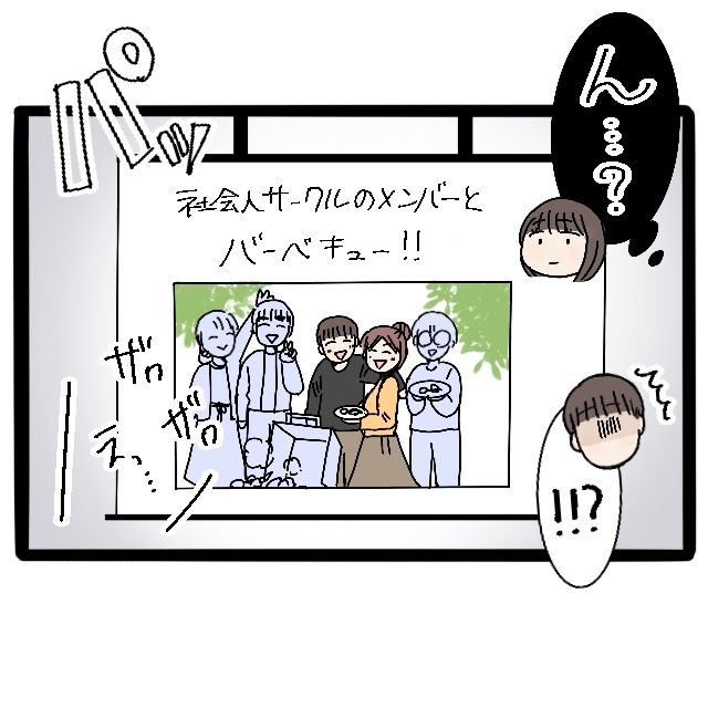 『社会人サークルのメンバーとバーベキュー!!』とコメントされた写真がスクリーンに映し出されると、