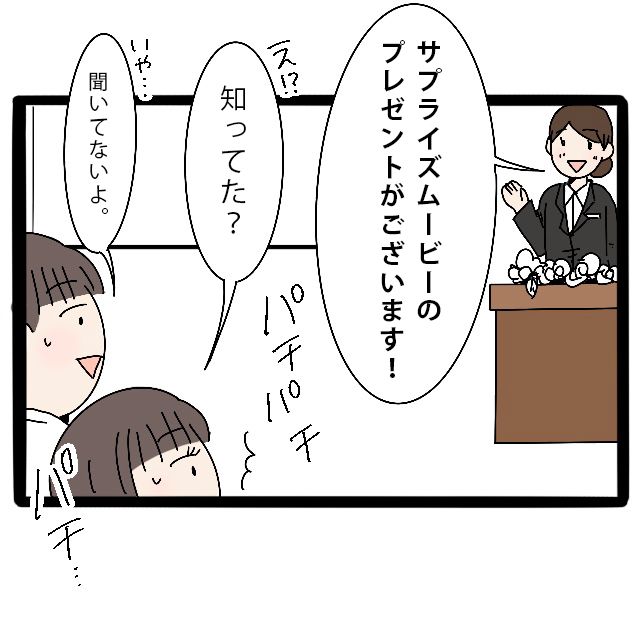 「ここで、新郎のお母様より、サプライズムービーのプレゼントがございます!」