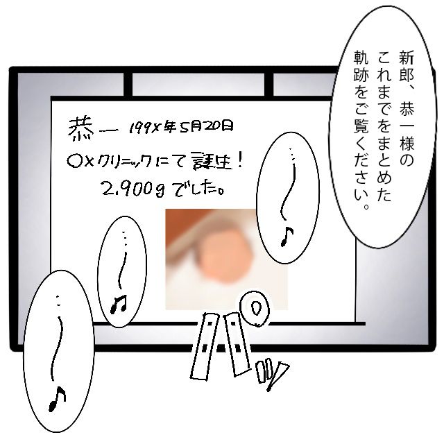 と、音楽とともに始まったのは、大きなスクリーンに映し出された恭一さんが生まれたばかりの赤ちゃんの時の写真でした。