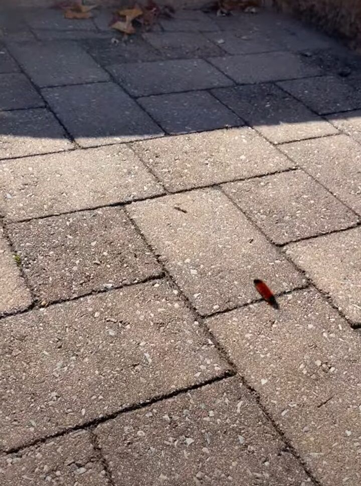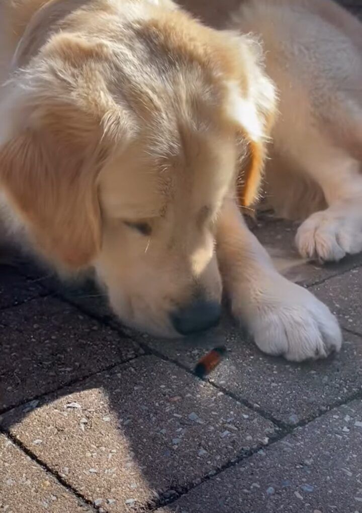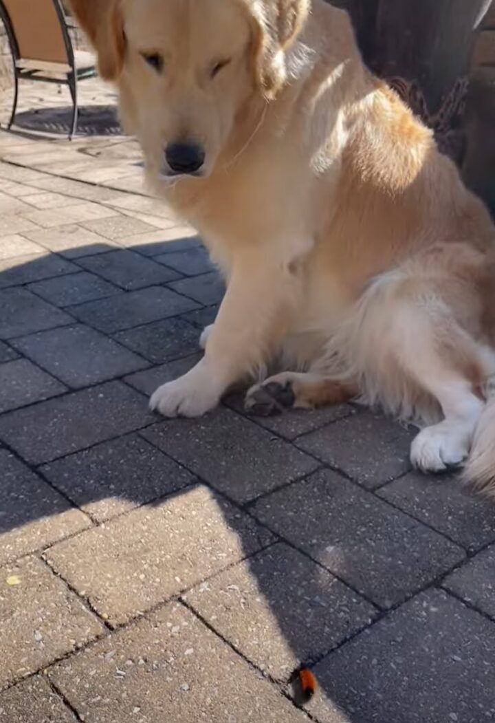 3. ゴールデンリトリバーが近付いて毛虫にきた毛虫にギョッとした?身を強ばらせたけど・・好奇心が勝ったみたい!【アメリカ・動画】