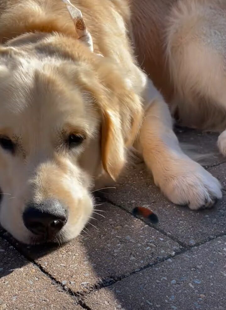 じっとその場から動かないゴールデンレトリバー。 いったい何事かと思えば・・・、この子の足元に近付いていくある生き物の姿が!!