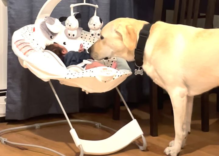 3. 「あの、赤ちゃん泣いてますよー!」小さな弟のお世話をしてくれる犬さん。