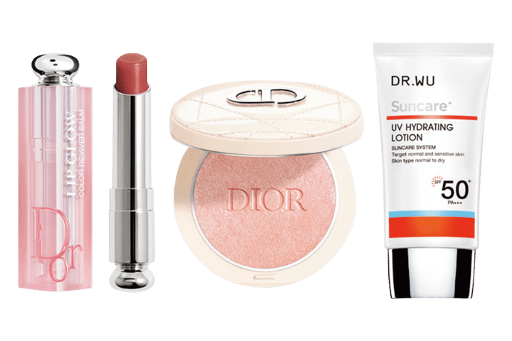 左から:ディオール アディクト リップグロウ 012、ディオール スキン フォーエヴァークチュール ルミナイザー 02 (共に本人私物)、サンスクリーン+モイスト SPF50+・ PA+++ 35mL ¥4,950(DR.WU)