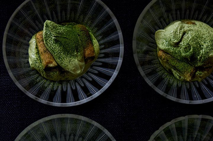 ⑥のクリームと抹茶液にくぐらせたフィンガービスケットを交互に重ねて盛り、仕上げに抹茶をふる。冷蔵庫で最低10分冷やす。